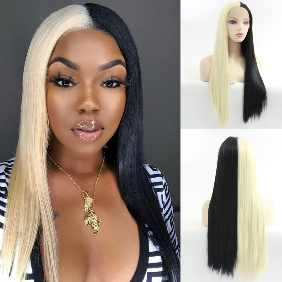 Half Blonde Black Silky Straight Hair Wig Synthetic Lace Front Wigs Gluless Heat Resistant Synthetic Long Straight Daily Party Cosplay Wig